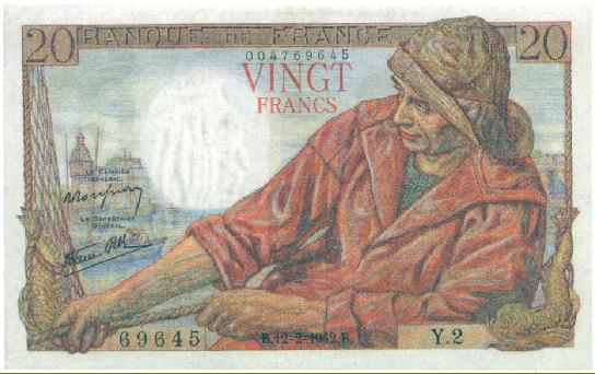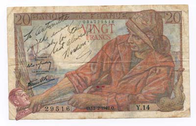 Le billet de 20 F "Pêcheur" se prêtait à un montage particulier : une figure d'Hitler, découpée dans un timbre-poste, était habilement glissée derrière la corde pour donner l'impression que le pêcheur était en train d'étrangler le dictateur.