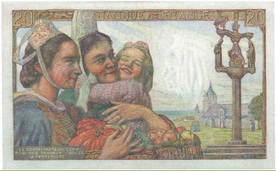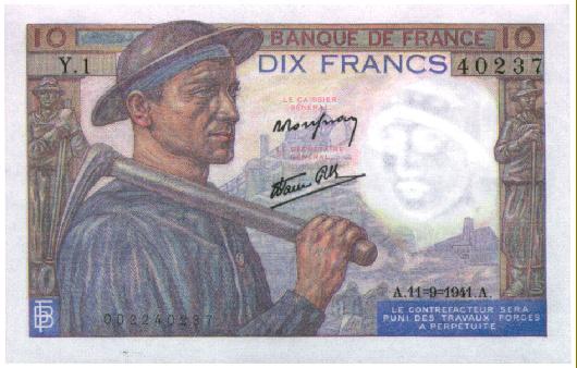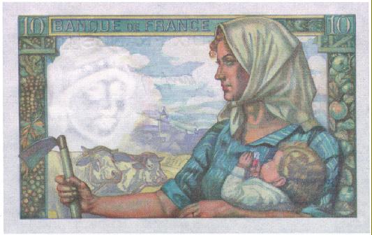 Le changement d'idéologie politique ne se traduit pas de façon aussi manifeste dans les billets créés par la Banque de France à la même époque. L'évocation des valeurs du travail et de la famille apparaît certes sur certains billets comme les coupures de 10 et 20 francs. Mais ces illustrations s'inscrivent d'une certaine manière dans le prolongement de la thématique des métiers apparue au cours de la Première Guerre Mondiale et que l'on retrouvera encore sur le billet de 100 francs mis en circulation en 1947.