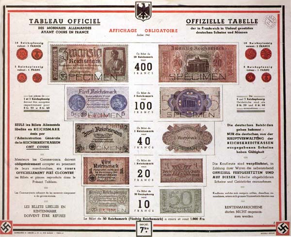 Avec la défaite militaire, la France se voit imposer un véritable diktat monétaire. Le franc devient une monnaie satellite du mark : il lui est lié par une parité fixe de 20 francs pour un Reichsmark, taux hautement avantageux pour l'occupant puisqu'on estime qu'un taux raisonnable aurait été de 11 ou 12 francs pour un mark. Grâce à un tel taux de change spoliateur, mais aussi à d'autres dispositions, les Allemands organisent avec méthode et efficacité la ponction sur l'économie française. De son côté, la politique des finances publiques laisse croître fortement la dette (multipliée par environ 3,5 entre 1940 et 1944) dont une partie non négligeable est constituée en avances de la Banque de France.