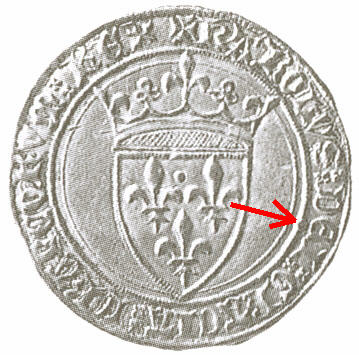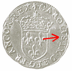 Cette monnaie présente la particularité de porter un G au centre du revers, marque de l'atelier de Poitiers, et un point «septième», marque de l'atelier d'Angers, sous le S de Carolus au droit.