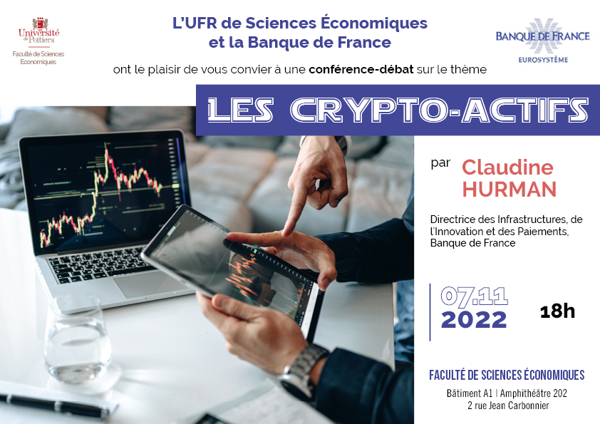 L'UFR de Sciences économiques et la Banque de France ont le plaisir de vous convier à une conférence-débat sur le thème : « Les crypto-actifs » le 7 novembre 2022 à 18h.
